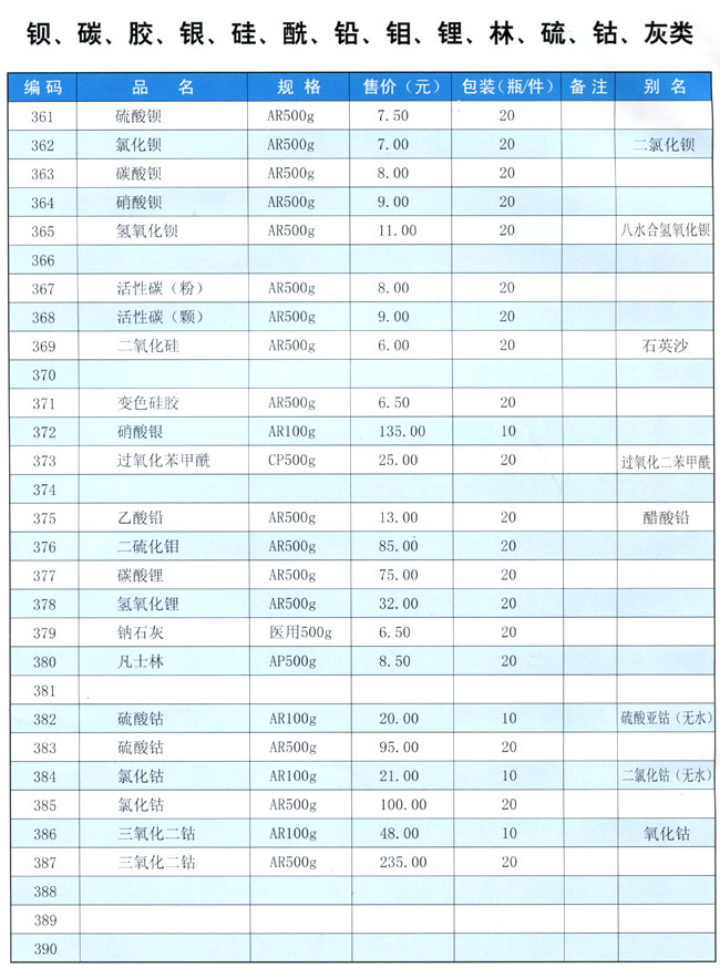 鈷、鋇、碳、膠、銀、硅、酰、鉛、鉬、鋰類